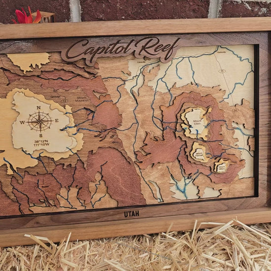 Bring the beauty of Capitol Reef National Park into your home with this handcrafted 3D wood map, featuring intricate layers, natural textures, and a stunning resin-filled river system.